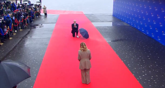 Kreu i qeverisë shihet teksa ulet në gjunjë ndërsa kryeministrja Giorgia Meloni mbërriti në tapetin e kuq.