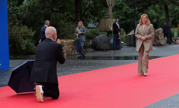 Kryeministrja e Italisë, Giorgia Meloni, bëri xhiron e rrjeteve sociale në Samitin e Komunitetit Politik Europian në Tiranë, kur u prit nga homologu shqiptar, Edi Rama, i cili iu sërish në gjunjë dhe më pas e përqafoi.