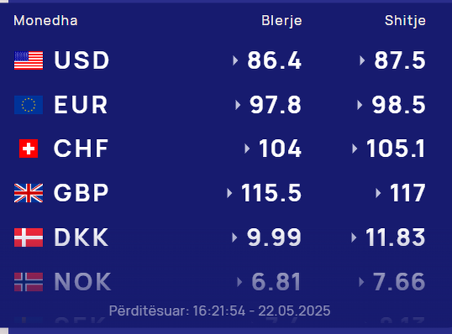 Sot, më 23 maj 2025, dollari amerikan, blihet me 86.4 lekë dhe shitet me 87.5 lekë.