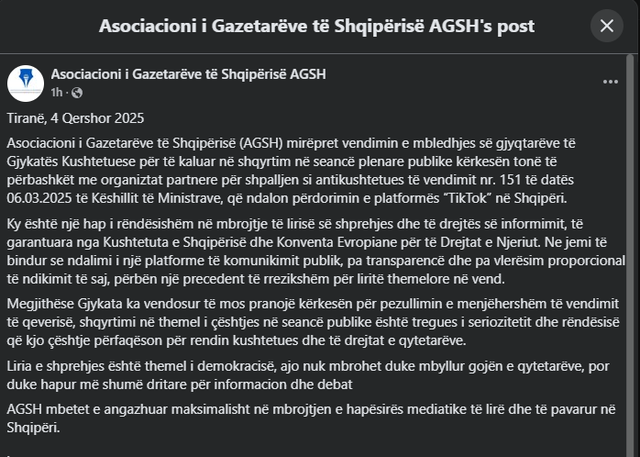 Asociacioni i Gazetarëve të Shqipërisë (AGSH) mirëpret vendimin e mbledhjes së gjyqtarëve të Gjykatës Kushtetuese për të kaluar në shqyrtim në seancë plenare publike kërkesën tonë të përbashkët me organiztat partnere për shpalljen si antikushtetues të vendimit nr. 151 të datës 06.03.2025 të Këshillit të Ministrave, që ndalon përdorimin e platformës “TikTok” në Shqipëri. Ky është një hap i rëndësishëm në mbrojtje të lirisë së shprehjes dhe të drejtës së informimit, të garantuara nga Kushtetuta e Shqipërisë dhe Konventa Evropiane për të Drejtat e Njeriut.