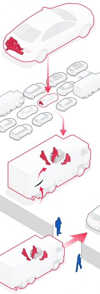 Kontrabandisti më pas ia kalon targën e kamionit një bashkëpunëtori në Mbretërinë e Bashkuar, i cili e ndjek automjetin pasi ai largohet nga Doveri dhe e merr emigrantin pasi ai ndalet. Shoferi i kamionit nuk ka idenë për përfshirjen e tyre, por rrezikon të gjobitet deri në 10,000 paund nëse udhëtari i paligjshëm gjendet në automjetin e tij nga zyrtarët.