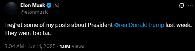Elon Musk ka bërë një hap pas në përplasjen e tij të fundit me presidentin amerikan Donald Trump, duke shprehur pendesë për disa nga komentet që kishte bërë më parë në rrjetet sociale.