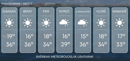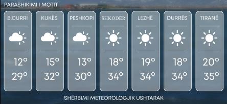 Sipas Shërbimit Meteorologjik Ushtarak moti parashikohet i kthjellët me vranësira të pakta dhe hera-herës deri mesatare kalimtare në relievet malore në lindje.