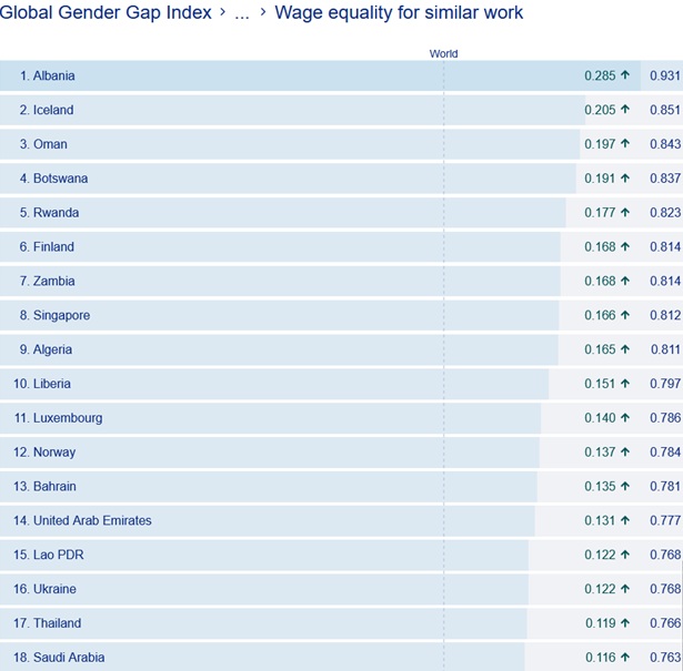 Sipas raportit, Shqipëria ka arritur të mbyllë 93.1% të hendekut gjinor në paga, që do të thotë se gratë shqiptare paguhen mesatarisht 93.1% të pagës që marrin burrat për të njëjtën punë – përqindja më e lartë në botë. Në vend të dytë renditet Islanda, me një përqindje prej 85.1%.