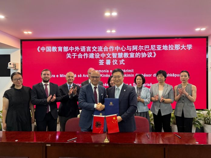 Përfaqësues nga Universiteti i Tiranës dhe Qendra kineze e Shkëmbimit dhe Bashkëpunimit Gjuhësor nënshkruan marrëveshjen për “Bashkëpunim në ngritjen e klasës inteligjente kineze” në ambientet e Institutit Konfuci pranë Universitetit të Tiranës.