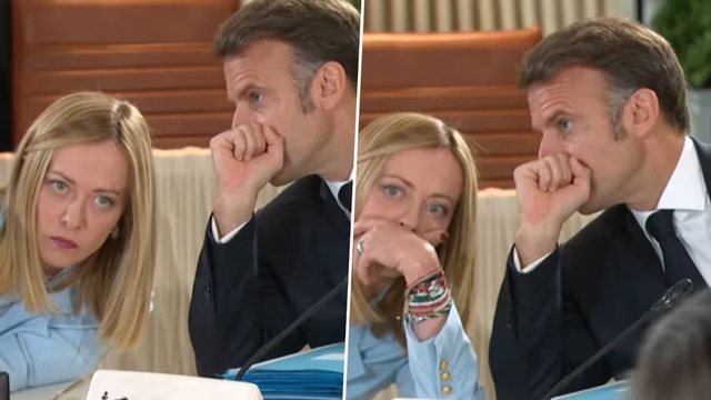 Gjatë një diskutimi në tryezën e rrumbullakët mes liderëve botërorë, Macron është filmuar teksa afrohet dhe i pëshpërit diçka në vesh Melonit, duke vendosur dorën përpara gojës për të shmangur leximin e buzëve nga kamerat.