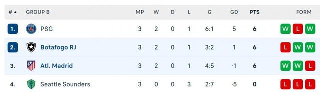 Me këtë renditje, PSG kalon si fituese e grupit dhe pret Inter Miamin në fazën e eliminatoreve, ndërsa Botafogo do të ketë përballje braziliane ndaj Palmeiras. Atletico Madrid, një nga favoritët për trofeun, largohet nga turneu në mënyrë të papritur, duke shënuar një dështim të madh në arenën ndërkombëtare.