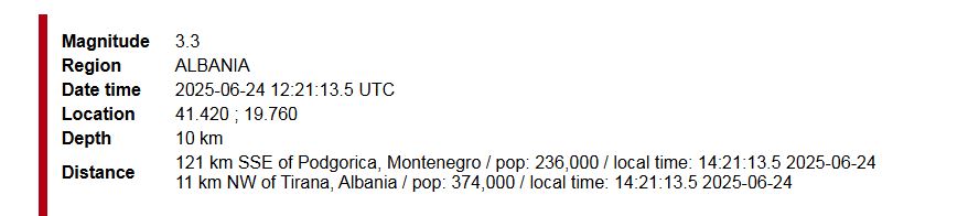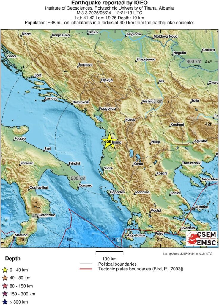 Rreth orës 14:21 me orën lokale, është ndjerë një tërmet me magnitudë 3.3 të shkallës Rihter, me epiqendër rreth 11 kilometra në veriperëndim të Tiranës.