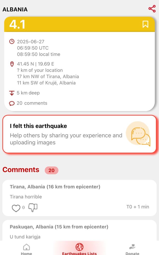 Vetëm pak sekonda pas lëkundjes së parë, është ndjerë edhe një paslëkundje e fortë me magnitudë 4.0, me epiqendër po në zonën e Fushë-Krujës, sipas të dhënave të para nga institucionet sizmologjike.
