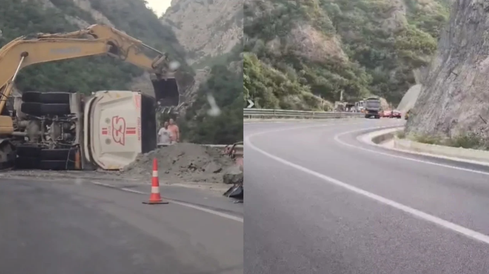 Një kamion me ngarkesë është përmbysur pak minuta më parë në vendin e quajtur “Shkalla e Tujanit”.