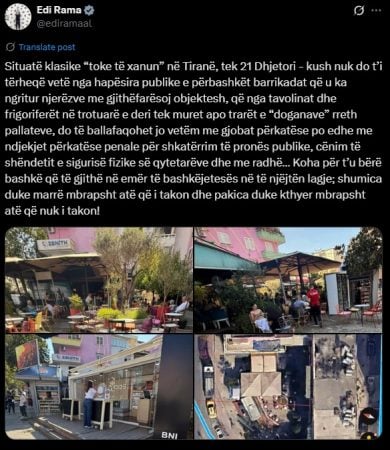 “Situatë klasike “toke të xanun” në Tiranë, tek 21 Dhjetori – kush nuk do t’i tërheqë vetë nga hapësira publike e përbashkët barrikadat që u ka ngritur njerëzve me gjithëfarësoj objektesh, që nga tavolinat dhe frigoriferët në trotuarë e deri tek muret apo trarët e “doganave” rreth pallateve, do të ballafaqohet jo vetëm me gjobat përkatëse po edhe me ndjekjet përkatëse penale për shkatërrim të pronës publike, cënim të shëndetit e sigurisë fizike së qytetarëve dhe me radhë… Koha për t’u bërë bashkë që të gjithë në emër të bashkëjetesës në të njëjtën lagje; shumica duke marrë mbrapsht atë që i takon dhe pakica duke kthyer mbrapsht atë që nuk i takon!”, shkruan Rama.