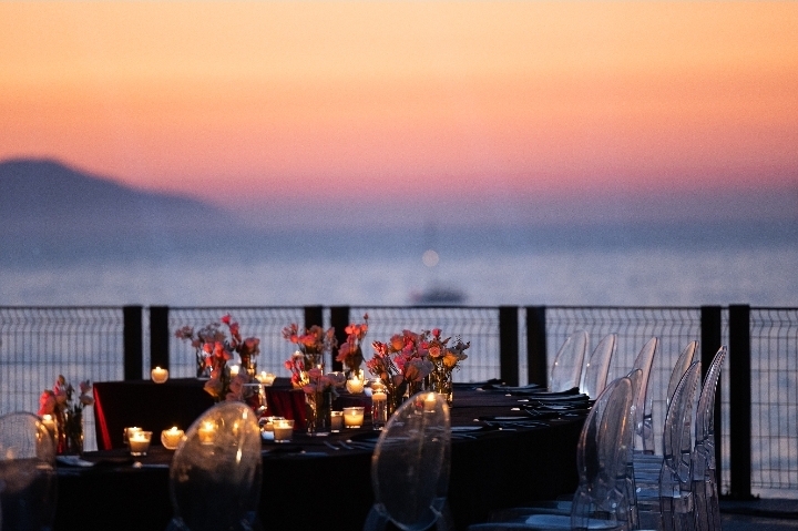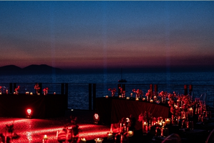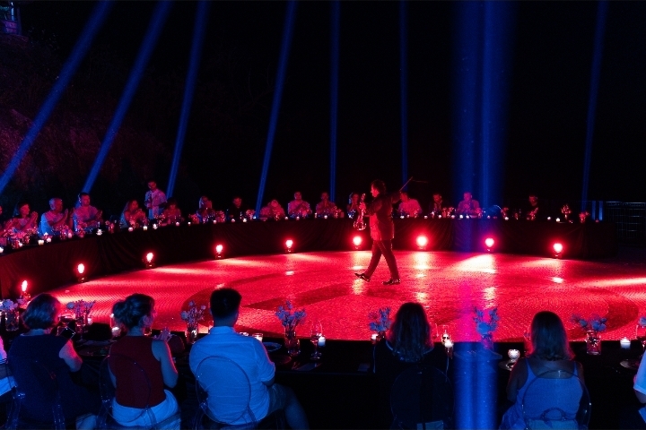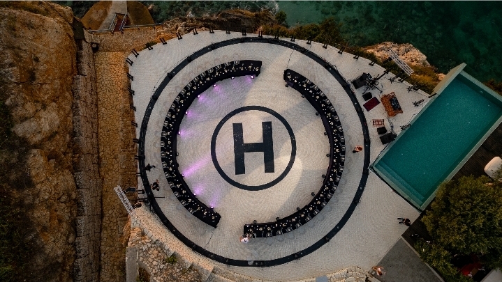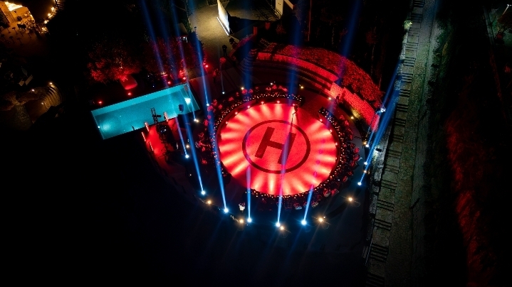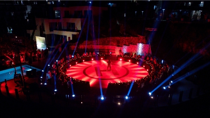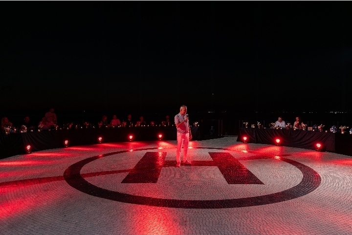 Kur dielli nisi të zbriste mbi det, gjithçka u kthye në spektakël. Pista e helikopterit në Marina Bay u shndërrua në një skenë gala. Tingujt e violinës së fuqishme të Olen Cesarit, i ftuari special i mbrëmjes, shoqëruan gotat që trokisnin dhe dritat që përthyeshin mbi valë. Arti, natyra dhe eleganca u shkrinë në një të vetme.