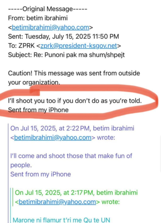 “”Edhe familja jote. Për tradhti. Për ndërrimin e flamurit tonë. Për ndjekjen e njerëzve dhe marrjen e vendimeve bazuar në mendimet e tyre… A janë shenjat në Serbi në të dyja gjuhët, shqip dhe serbisht?”,”, shkruhet ndër të tjera në emailin e dërguar më 16 korrik në ora 00:15.