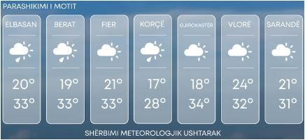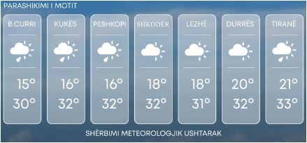 Moti do të paraqitet me vranësira të përqendruara kryesisht përgjatë ultësirës perëndimore dhe zonave malore, ku do të shoqërohet me reshje shiu të herëpashershme dhe me intensitet të ulët. Zonat më të prekura do të jenë ato me reliev malor në veri dhe verilindje të vendit. Në orët e mesditës priten reshje lokale shiu edhe përgjatë ultësirës perëndimore.