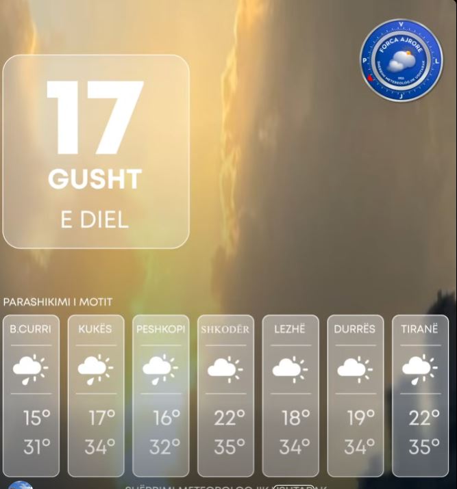 TIRANË- Moti sot do të jetë përgjithësisht i kthjellët gjatë paradites, por me prani të vranësirave të lehta që mund të shfaqen në pjesë të ndryshme të vendit, veçanërisht në zonat malore dhe ato lindore. Pasdite pritet që këto vranësira të bëhen më të theksuara, por nuk ka sinjale për reshje shiu.