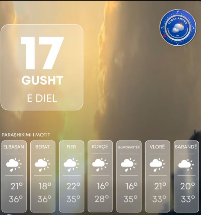 Temperaturat parashikohen të jenë të larta gjatë gjithë ditës, me vlera që do të lëvizin nga rreth 18°C në orët e para të mëngjesit, deri në 33°C në orët e mesditës. Era do të fryjë me intensitet të ulët deri mesatar, kryesisht nga drejtimi veriperëndimor.