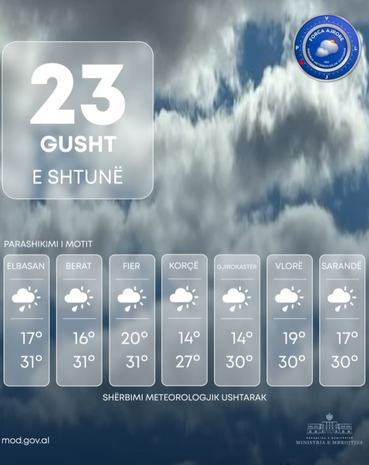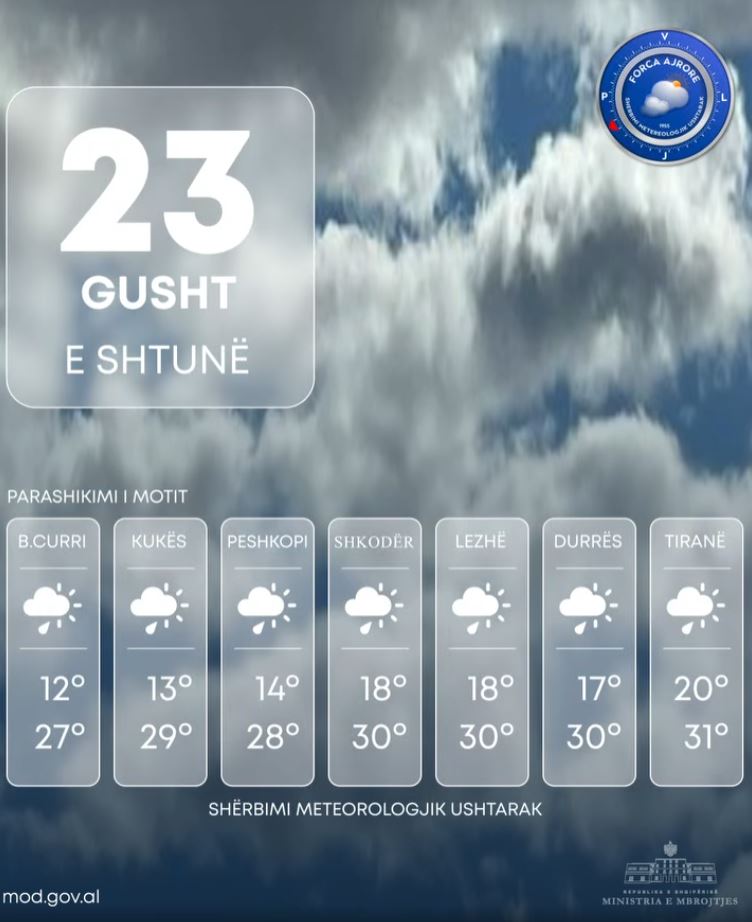 Moti parashikohet fillimisht me kthjellime si dhe vranësira të pakta kalimtare ndërsa prej orëve të mesditës deri ato të pasdites vonë mot me vranësira mesatare deri të dendura si dhe intervale të herëpashershme me diell.
