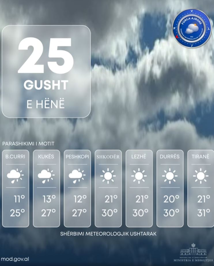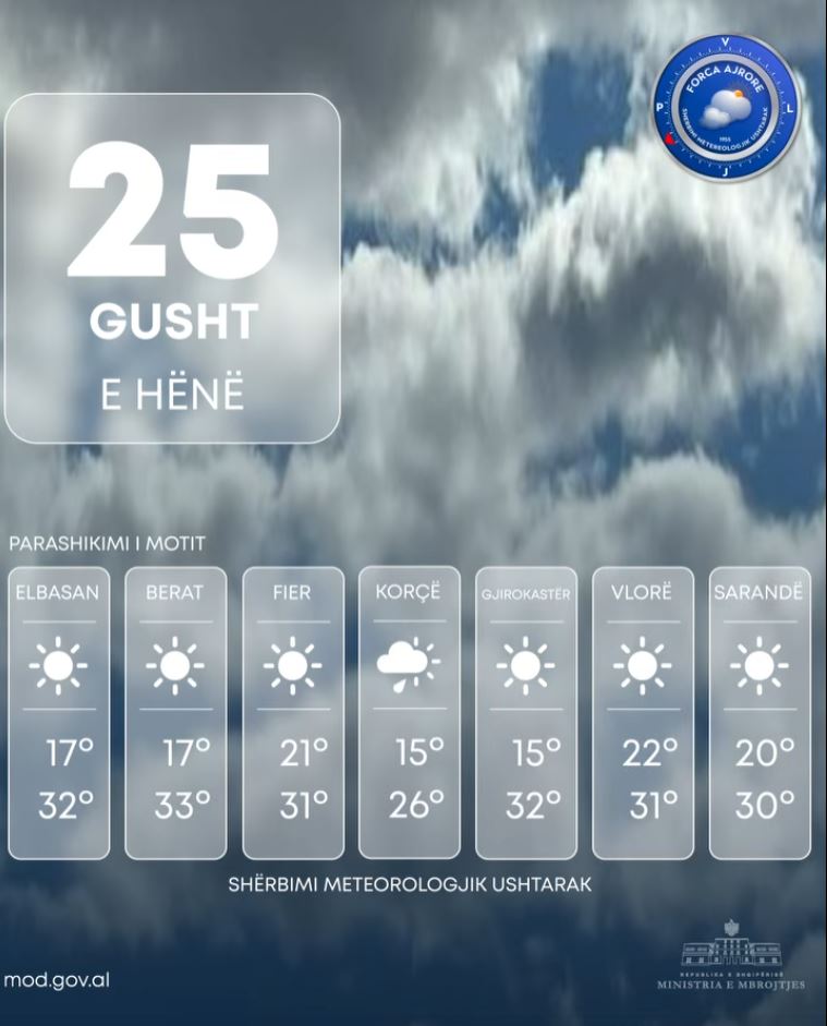 Moti parashikohet i kthjellët në të gjithë territorin ndërsa nga orët e mesditës deri ato të pasdites alternime vranësirash kalimtare të pakta deri mesatare në relievet malore në lindje.