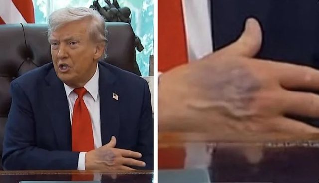 Megjithatë, në momente të ndryshme gjatë konferencës për shtyp të së hënës, një mavijosje është e dukshme në pjesën e pasme të dorës së tij. Kjo ishte përsëri e dukshme kur Trump priti homologun e tij të Koresë së Jugut, Lee Jae-myung, në Zyrën Ovale.