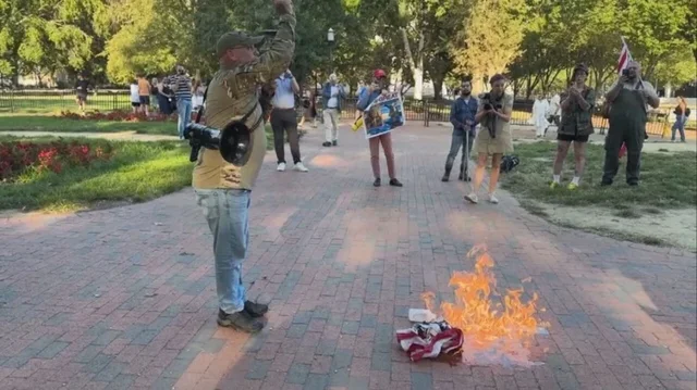 “Po e djeg këtë flamur në shenjë proteste ndaj këtij presidenti fashist që ndodhet në këtë ndërtesë”, tha një protestues duke përdorur një megafon në një park të vogël jo shumë larg Shtëpisë së Bardhë, sipas videos së shpërndarë në mediat sociale dhe të transmetuar gjithashtu nga mediat amerikane.