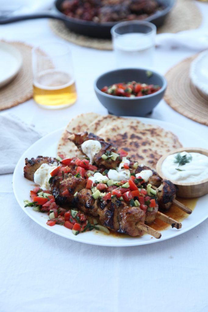 2. Shish pule me kos aromatik, sallatë dhe pita të lehta