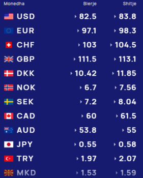 Euro këmbehet me 97.1 lekë në blerje dhe 98.3 lekë në shitje. Franga zvicerane ka një kurs prej 103 lekësh në blerje dhe 104.5 lekësh në shitje.