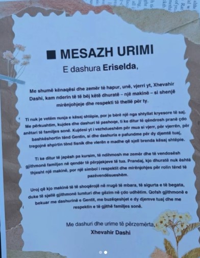 Letra, e mbushur me fjalë mirënjohjeje dhe dashurie, nuk është thjesht një urim, por një dëshmi e lidhjes së fortë që mund të ekzistojë midis një vjehrri dhe një nusjeje. Ai e cilëson Eriseldën si “një nga shtyllat kryesore të kësaj familjeje” dhe e falënderon për përkushtimin, kujdesin dhe dashurinë që ajo jep çdo ditë. Letra e plotë: