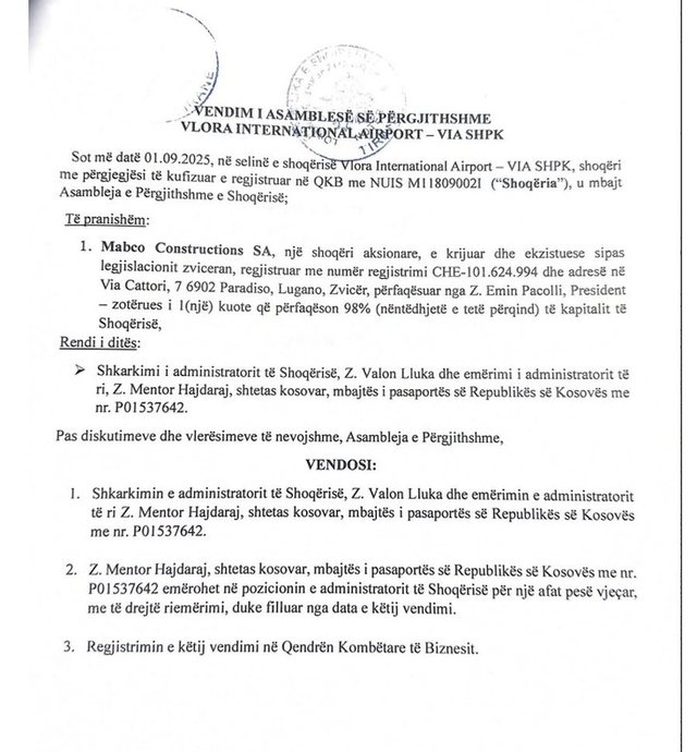 Vendimi është marrë dy ditë më parë, në mënyrë të njëanshme, vetëm me votat e shoqërisë Mabco Construction sa e Pacollit, ndërkohë që aksioneri i minorancës, 2A Group, nuk ka qenë i pranishëm fare në mbledhje.