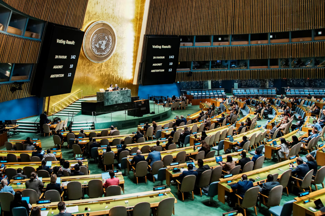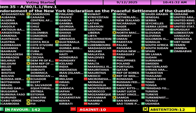 Nju jork- Sot, nën udhëheqjen e Francës dhe Arabisë Saudite, 142 vende kanë miratuar Deklaratën në Asamblenë e Kombeve të Bashkuara, mbi zbatimin e Zgjidhjes me Dy Shtete mes Palestinës dhe Izraelit.