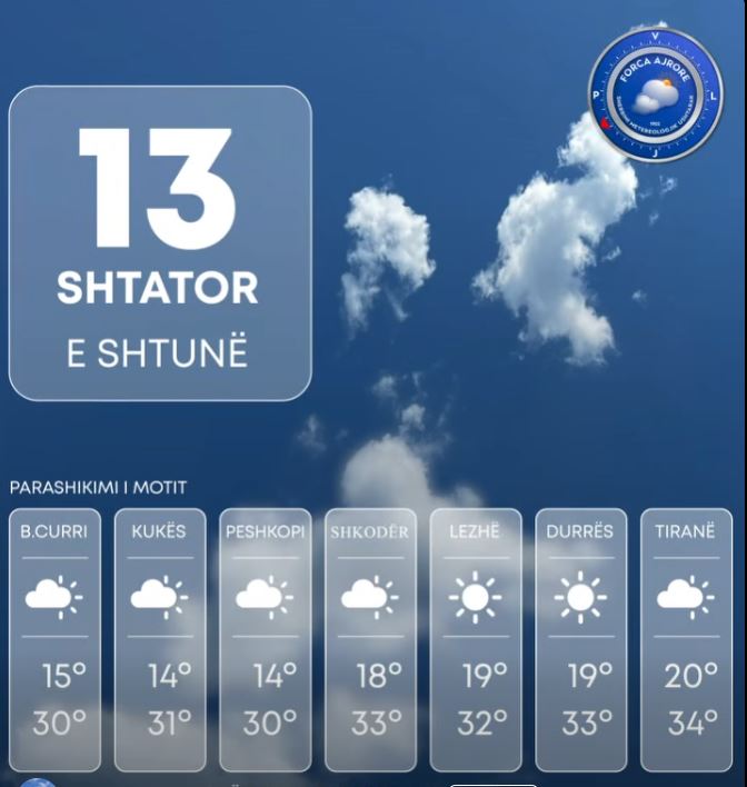 Era do të fryjë me drejtim kryesor nga kuadrati i perëndimit me shpejtësi mesatare 6 m/s, ndërsa në zonat luginore dhe përgjatë vijës bregdetare hera-herës do të arrijë shpejtësi deri 10m/s.