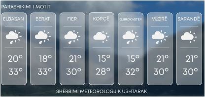 Moti parashikohet i kthjellët dhe alternime vranësirash të pakta deri mesatare, të cilat do të shoqërohen me reshje të dobëta shiu kryesisht përgjatë relieveve malore në orët e mesditës e pasdites, ndërsa pjesa tjetër e territorit parashikohet pa reshje.
