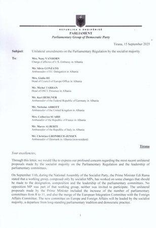 TIRANË- Kreu i Grupit Parlamentar të Partisë Demokratike, Gazment Bardhi ka ngritur shqetësimin mbi ndryshimet e propozuara nga kryeministri Edi Rama në Rregulloren e Parlamentit gjatë Asamblesë Kombëtare të PS-së në 11 shtator. Lidhur me këtë Bardhi u është drejtuar me një letër nëntë ambasadave në Tiranë, përfshirë ambasadën e Shteteve të Bashkuara dhe Delegacionin e Bashkimit Evropian.
