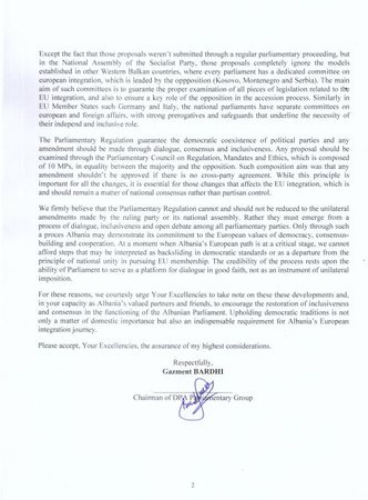 Për këto arsye, me mirësjellje nxisim shkëlqesitë tuaja që të merrni parasysh këto zhvillime dhe në cilësitë tuaj si partnerë dhe miq të çmuar të vendit tonë, të inkurajoni rivendosjen e gjithëpërfshirjes dhe konsensusit në funksionimin e Kuvendit të Shqipërisë. Ruajtja e traditave demokratike nuk është vetëm një çështje me rëndësi të brendshme, por një kërkesë e domosdoshme për rrugëtimin e integrimit evropian të Shqipërisë”, thuhet në letrën e Bardhit.