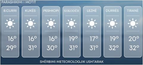 Vendi ynë këtë të martë do të jetë në ndikimin e kushteve atmosferike të qëndrueshme. Moti parashikohet i kthjellët në të gjithë territorin.