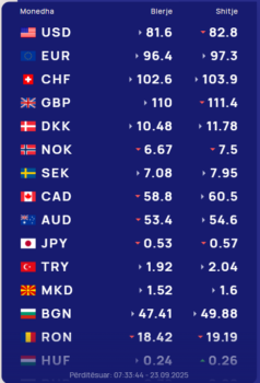 Franga zvicerane do të blihet me 102.6 lekë dhe do të shitet me 103.9 lekë, ndërsa paundi britanik do të këmbehet me 110 lekë në blerje dhe 111.4 lekë në shitje.