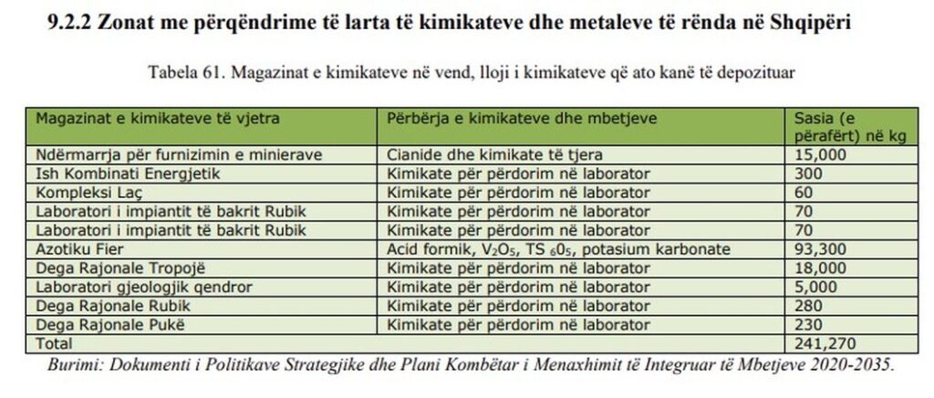 Në Fier, ish-Uzina e Azotikut ka lënë pas mbi 850 m³ solucione të ndotura me përmbajtje arseniku, ndërsa magazinat e vjetra ruajnë më shumë se 93 mijë kg kimikate të ndryshme, me rrezik potencial për kontaminim të ujërave nëntokësore.