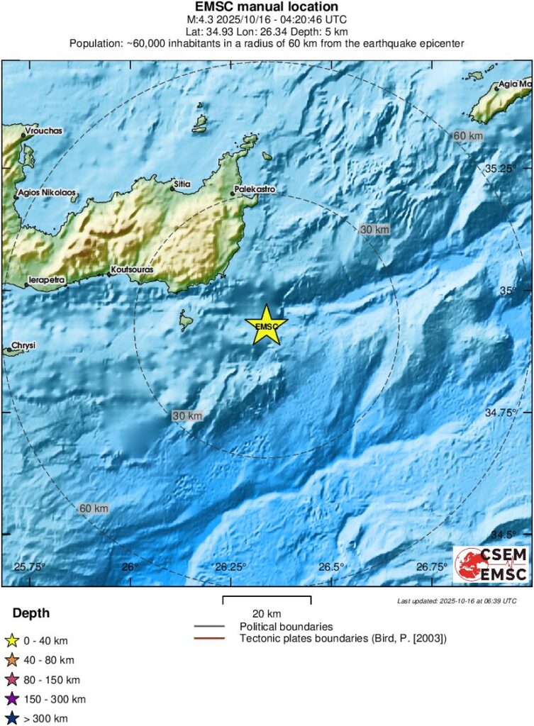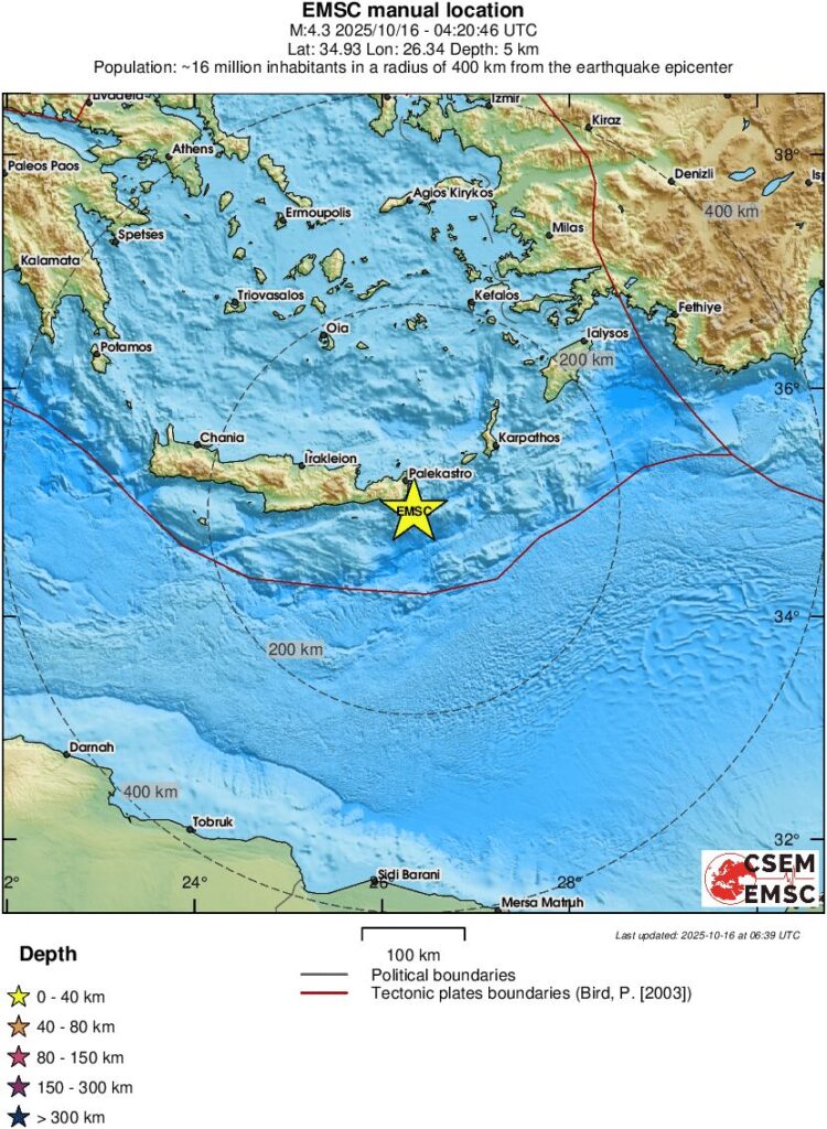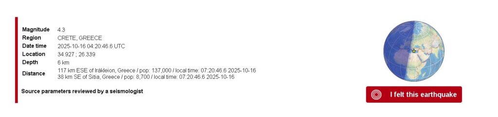 Një tërmet me magnitudë 4.3 sipas shkallës Rihter ka goditur mëngjesin e sotëm zonën e Mesdheut Lindor, pranë bregdetit të Greqisë. Lëkundjet u regjistruan në orën 07:20 të mëngjesit, sipas orës lokale.
