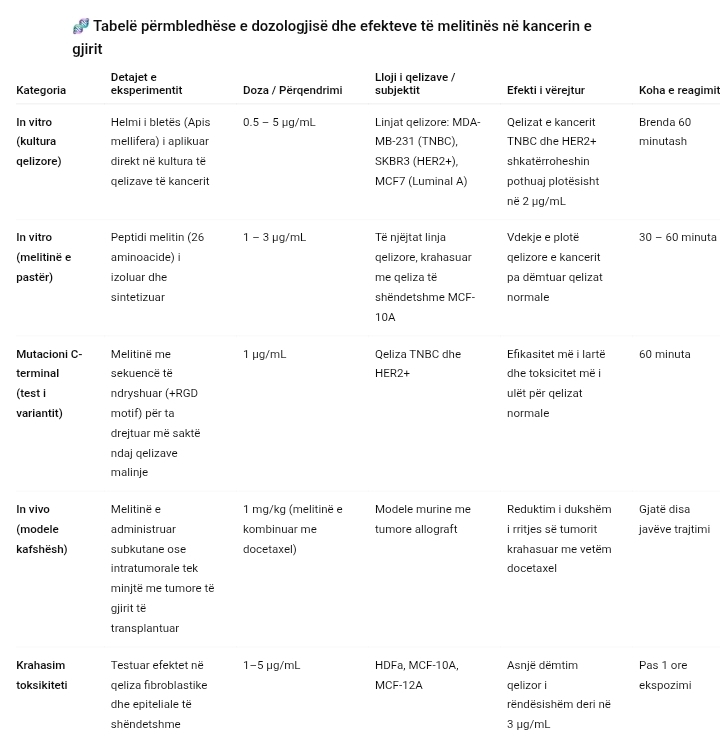 In vitro (kultura qelizore) Helmi i bletës (Apis mellifera) i aplikuar direkt në kultura të qelizave të kancerit 0.5 – 5 µg/mL Linjat qelizore: MDA-MB-231 (TNBC), SKBR3 (HER2+), MCF7 (Luminal A) Qelizat e kancerit TNBC dhe HER2+ shkatërroheshin pothuaj plotësisht në 2 µg/mL Brenda 60 minutash