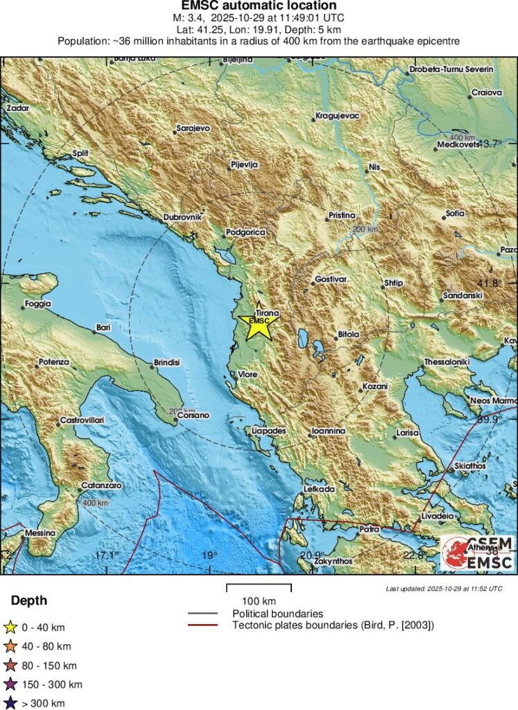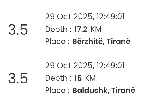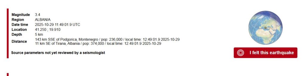 29 Tetor 2025 – Një tërmet me magnitudë 3.5 ballë goditi sot Shqipërinë në orën 12.49.