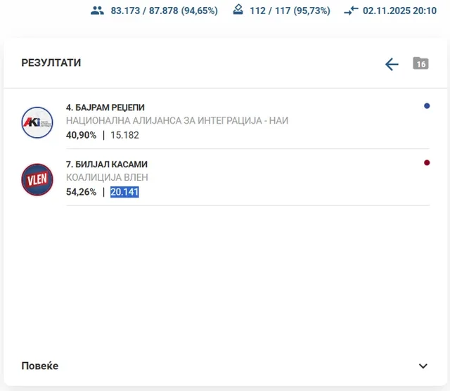 MAQEDONI E VERIUT- Komisioni Shtetëror i Zgjedhjeve në Maqedoninë e Veriut ka nisur me publikimin e rezultateve të para për Komunën e Tetovës. Me 94.65% e votave të numëruara, Koalicioni Vlen ka shumë gjasa që të fitojë këtë komunë.