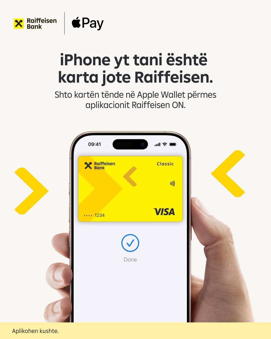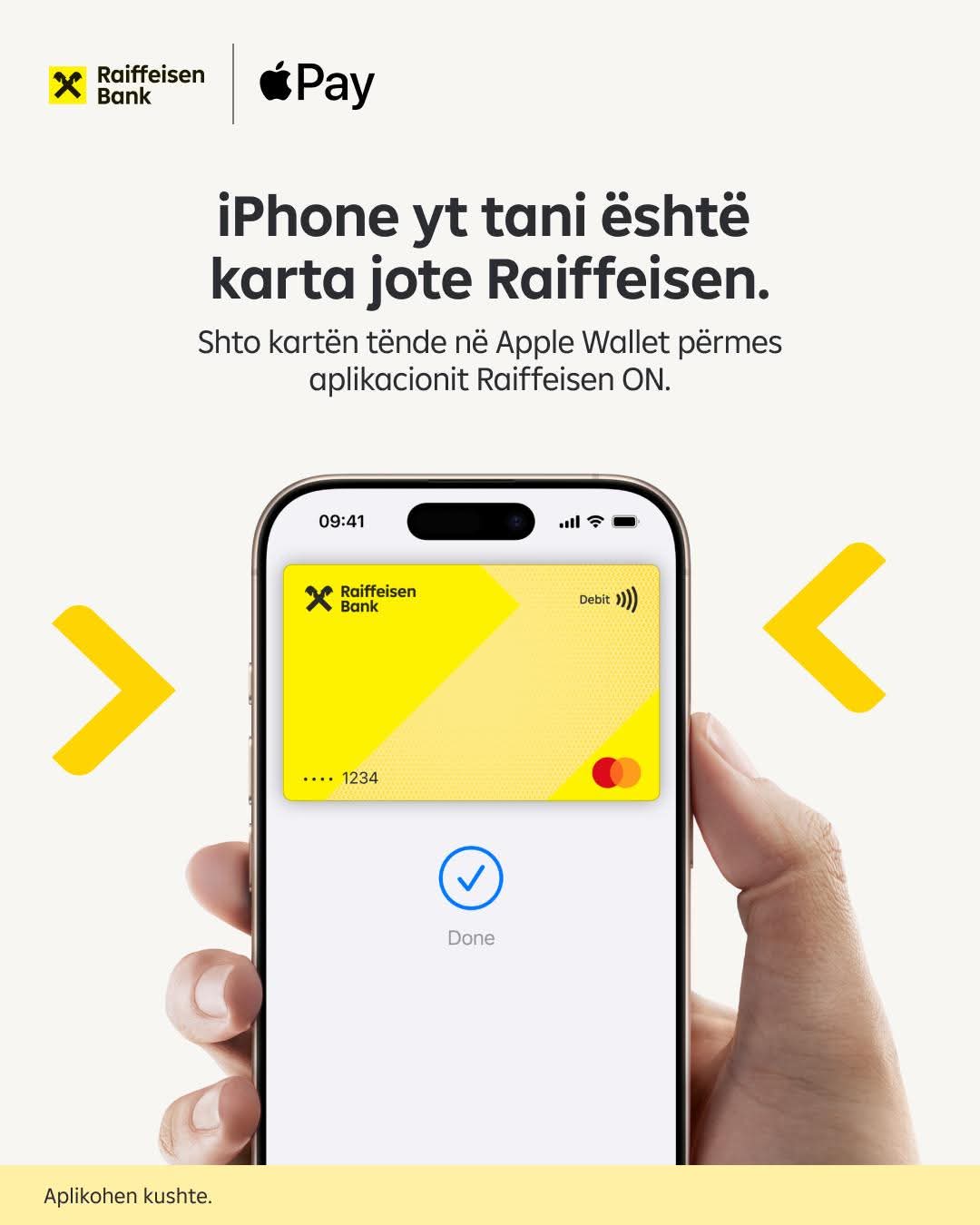 Tiranë, 3 nëntor 2025 — Raiffeisen Bank Shqipëri sjell Apple Pay për mbajtësit e kartave Visa & Mastercard në Shqipëri. Apple Pay është një mënyrë e lehtë, e sigurt dhe private për të paguar në dyqane, aplikacione dhe online.