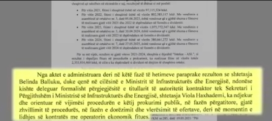 Sipas dosjes së SPAK, Balluku, edhe pse formalisht kishte deleguar përgjegjësitë e titullarit të autoritetit kontraktor tek Sekretari i Përgjithshëm i Ministrisë së Infrastrukturës dhe Energjisë, në praktikë ka ndjekur personalisht procedurën e prokurimit publik, që nga faza përgatitore, gjatë zhvillimit të procedurës, vlerësimit të ofertave, e deri në firmosjen e kontratës me operatorin ekonomik fitues – bashkimin e kompanive turke “INTEKAR – ASL”. “Nga aktet e administruara deri në këtë fazë të hetimeve paraprake rezulton se Belinda Balluku, duke qenë në cilësinë e Ministrit të Infrastrukturës dhe Energjisë, ndonëse kishte deleguar formalisht përgjegjësitë e titullarit të autoritetit kontraktor, ka ndjekur dhe orientuar në vijimësi procedurën e këtij prokurimi publik në çdo fazë,” thuhet në dosjen e SPAK.