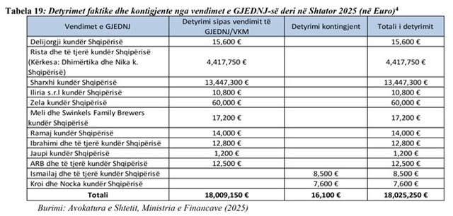 Shteti shqiptar iu detyrohet ish-pronarëve një dëmshpërblim prej 18 milionë euro për gjyqet e fituara në Strasburg. Detyrimi është krijuar deri në shtator të vitit 2025, sipas të dhënave të Ministrisë së Financave dhe Ekonomisë të bëra publike me projektbuxhetin e vitit 2026, për 12 çështje të fituara në Gjykatën e të Drejtave të Njeriut në Strasburg.