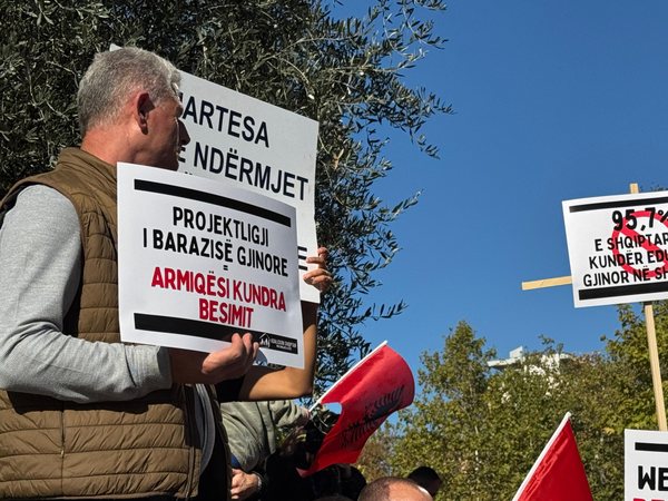 Me pankarta në duar ‘Jo gjinorizimit të fëmijëve’, ‘Ka vetëm dy gjini’, mashkull femër’ dhjetëra protestues janë mbledhur para Kuvendit për të kundërshtuar projektligjin për barazinë gjinore