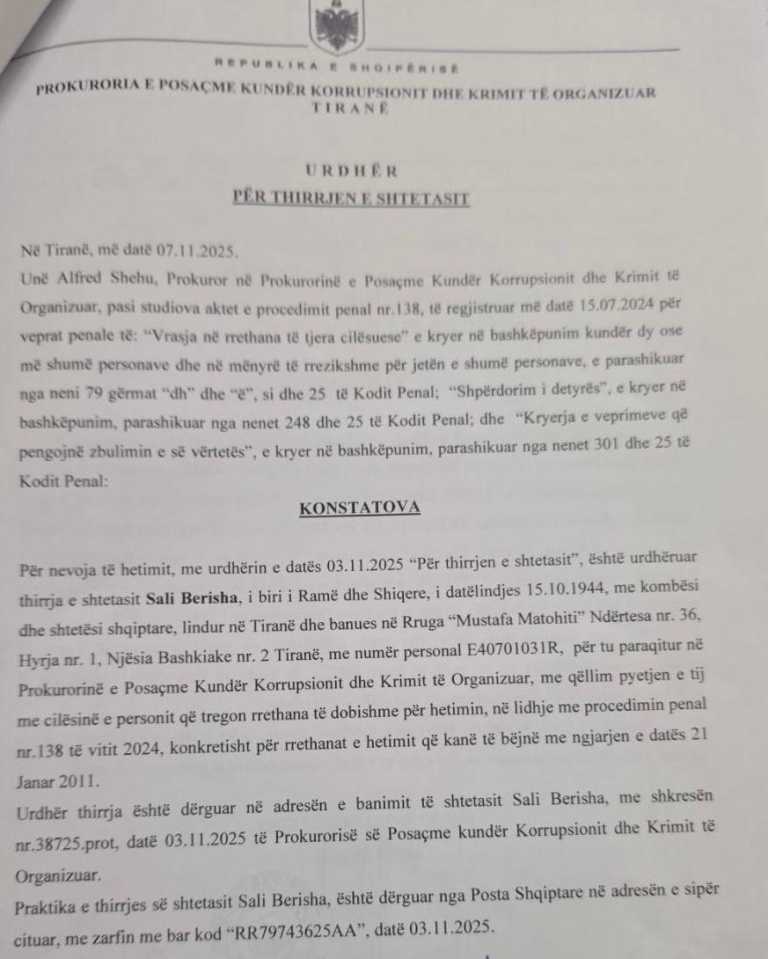 “Për nevoja të hetimit, me urdhërin e datës 03.11.2025 "Për thirrjen e shtetasit", është urdhëruar thirrja e shtetasit Sali Berisha, i biri i Ramë dhe Shiqere, i datëlindjes 15.10.1944, me kombësi dhe shtetësi shqiptare, lindur në Tiranë dhe banues në Rruga "Mustafa Matohiti Ndërtesa nr. 36, Hyrja nr. 1. Njësia Bashkiake nr. 2 Tiranë, me numër personal E40701031R, për tu paraqitur në Prokurorinë e Posaçme Kundër Korrupsionit dhe Krimit të Organizuar, me qëllim pyetjen e tij me cilësinë e personit që tregon rrethana të dobishme për hetimin, në lidhje me procedimin penal nr.138 të vitit 2024, konkretisht për rrethanat e hetimit që kanë të bëjnë me ngjarjen e datës 21 Janar 2011”.