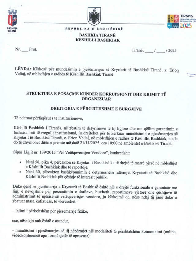Tiranë- Këshilli Bashkiak i Tiranës i ka dërguar një kërkesë SPAK-ut për të lejuar pjesëmarrjen e kryebashkiakut Erion Veliaj në mbledhjen e ardhshme të Këshillit, që do të mbahet në datën 21 nëntor, ditë e premte.