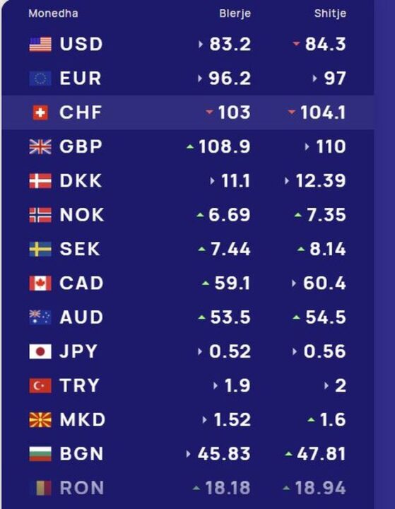 Për kursin e monedhave të tjera shihni tabelën e mëposhtme: