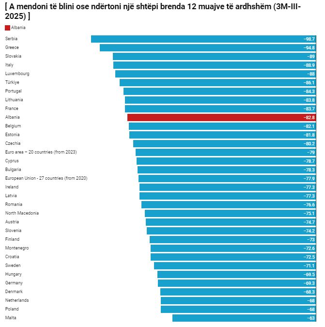 Në krahasim me mesataren e Bashkimit Europian (-77.9) dhe të vendeve të eurozonës (-79.0), Shqipëria paraqitet më pesimiste, duke pasqyruar vështirësitë ekonomike dhe çmimet e larta të tregut, veçanërisht në Tiranë dhe zonat bregdetare, ku kërkesa e investitorëve vendas dhe të huaj ka çuar çmimet përtej mundësive të shtresës së mesme.