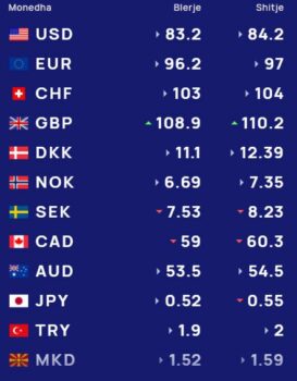 Ndërsa paundi britanik blihet me 108.9 lekë dhe shitet me 110.2 lekë.