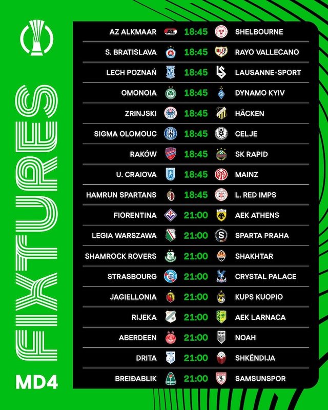 ZVICER – Sot, e enjte, më 27 nëntor, në dy orare do të luhen ndeshjet e javës së 4-t të Konferencë League. Ja kalendari dhe orari I ndehjeve: